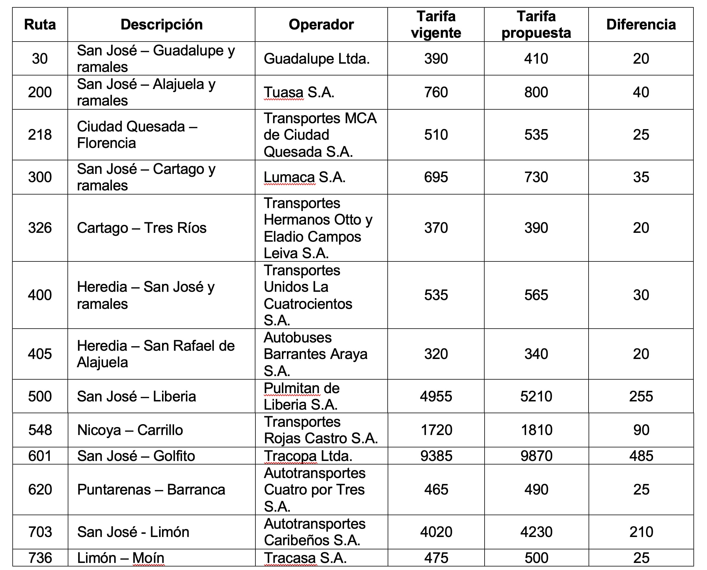 En este caso, subirán los precios de 50% del total de 377 rutas y ramales con cobros autorizados. Eso equivale a poco más de 4.000 tarifas vigentes, de estas 3.093 (72,3%) subirán entre ¢5 y ¢55.