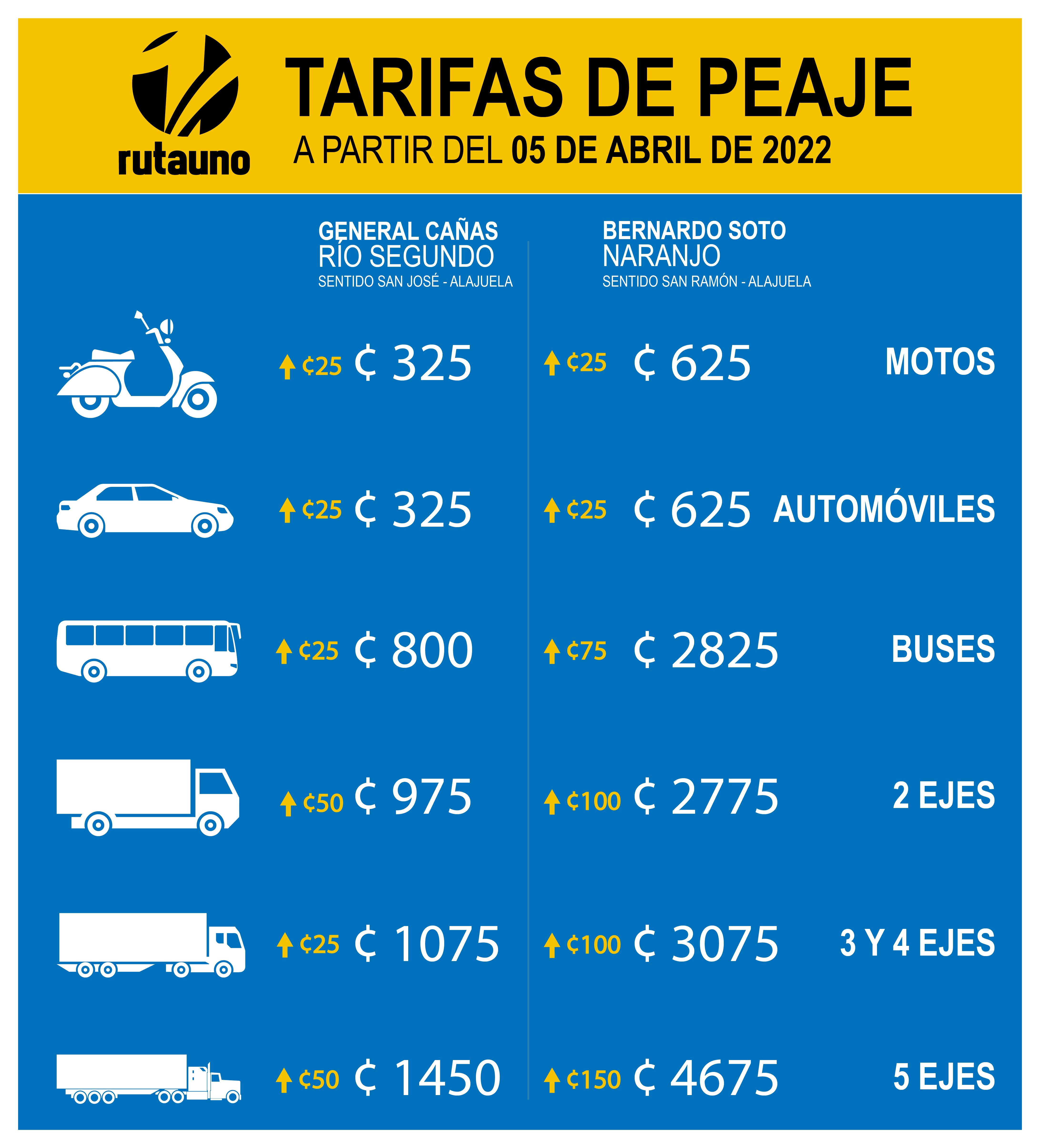 De acuerdo con Ruta Uno, todos los vehículos notarán variaciones de entre ¢25 y ¢50 en la estación de Río Segundo, mientras que, en la de Naranjo, deberán pagar entre ¢25 y ¢150 más. Por ejemplo, los automóviles pasarán a pagar ¢25 más en ambos peajes, es decir, ¢325 en Río Segundo y ¢625 en Naranjo.