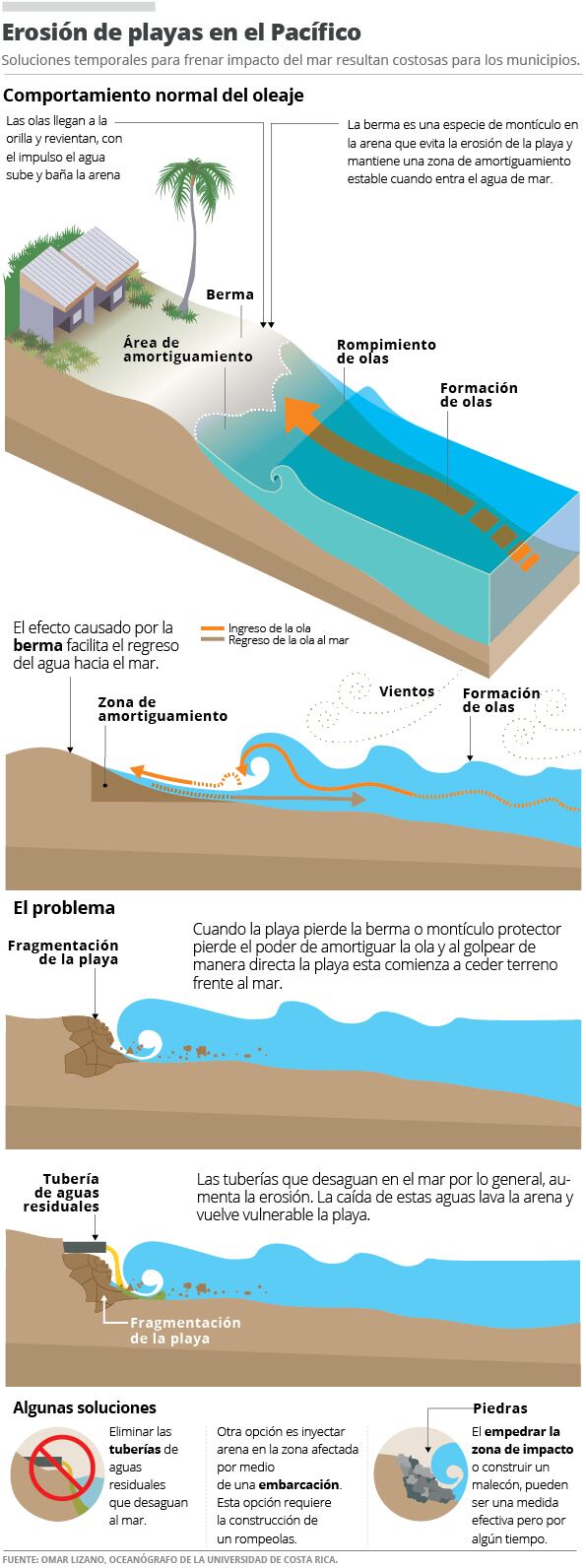 De acuerdo con Omar Lizano, oceanógrafo del Centro de Investigación en Ciencias del Mar y Limnología (Cimar), ese fenómeno está relacionado con que el desgaste de sedimento en la playa genera una grada que se hace cada vez mayor cuando hay mareas altas.