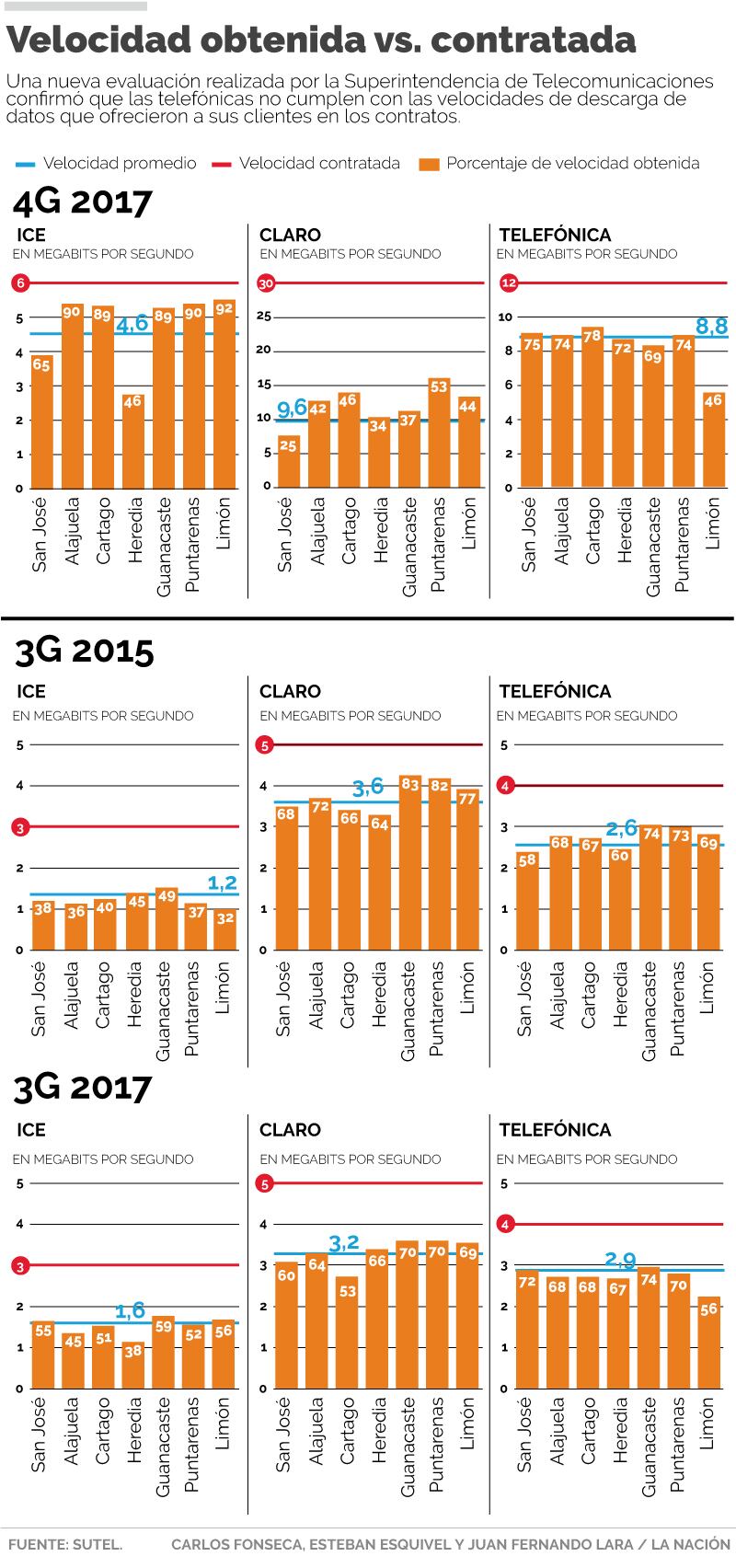 Los clientes de las tres mayores empresas telefónicas del país siguen sin recibir la velocidad de descarga de datos convenida en sus contratos, según un nuevo estudio de calidad de la Superintendencia de Telecomunicaciones (Sutel) con datos recopilados en noviembre del 2017.