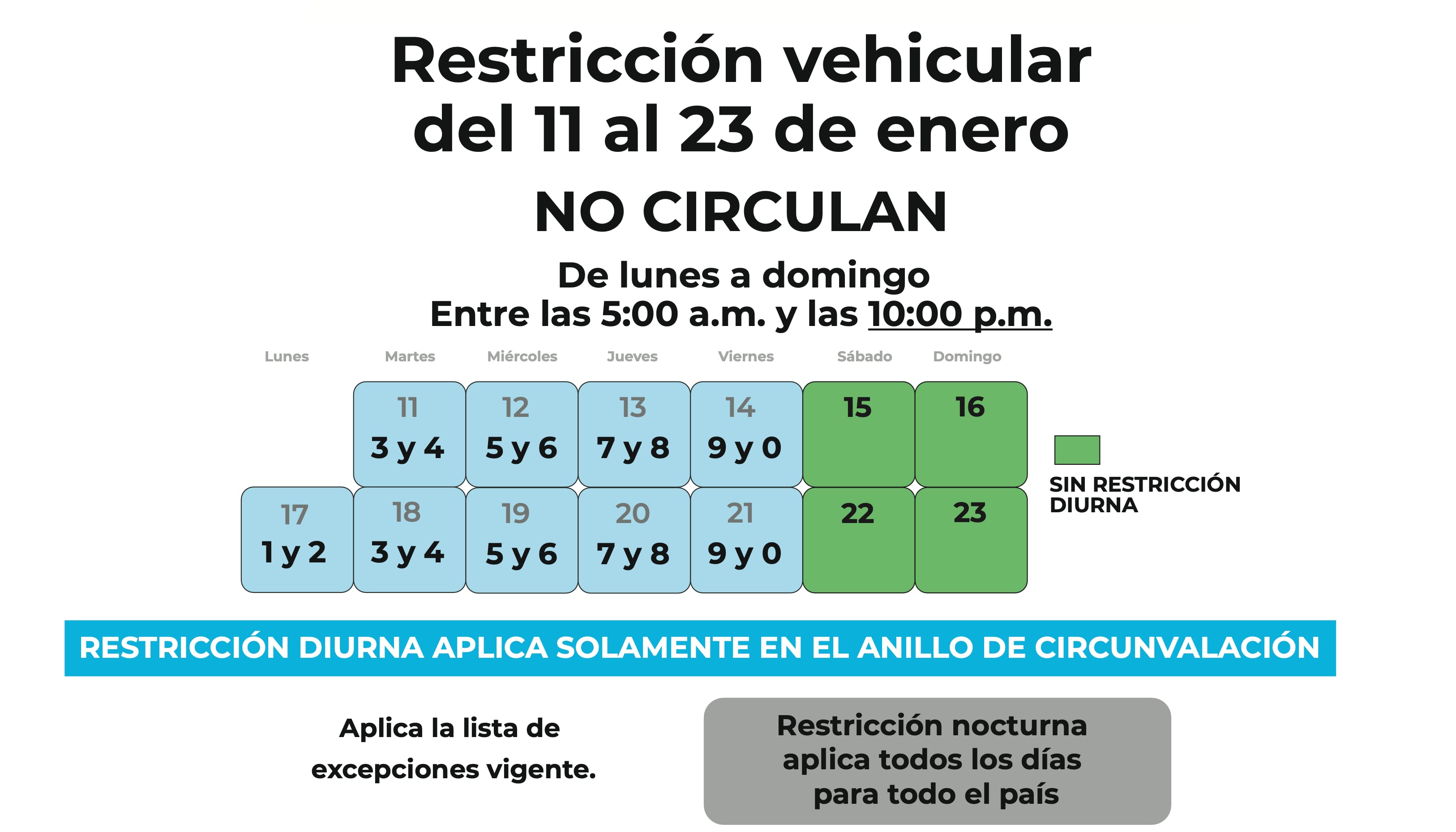 La restricción vehicular sanitaria diurna seguirá solo para el anillo de circunvalación en San José a partir del martes 11 de enero. Además, los fines de semana los conductores podrán circular durante el día sin importar la terminación de su placa (sea par o impar), pues no habrá cambios.