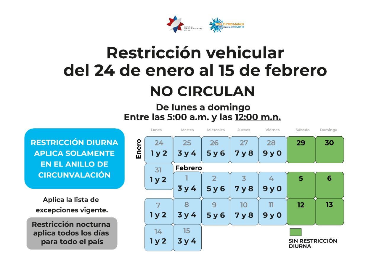 A partir de este lunes 24 de enero, la restricción vehicular regirá de medianoche a 5 a. m. y así seguirá al menos hasta el 15 de febrero, anunció el Gobierno el viernes. Entretanto la restricción diurna se aplicará entre semana solo en el anillo de circunvalación de San José.