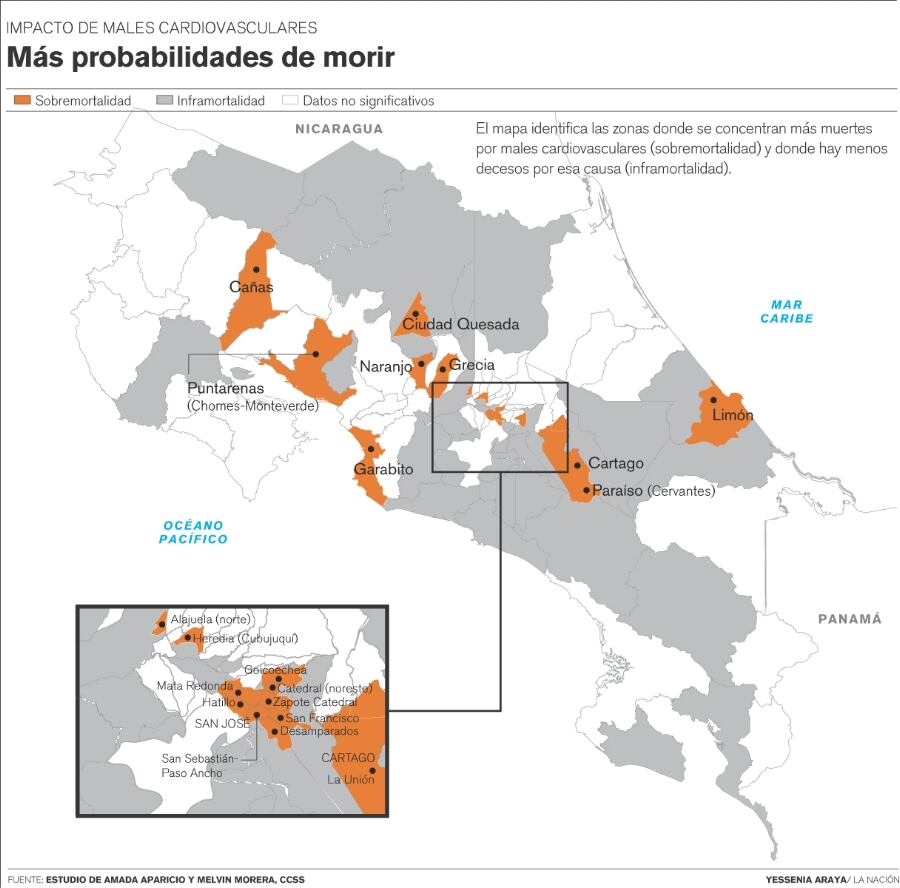 Aquellos cantones donde las muertes por males cardiovasculares superaron el número esperado para el perfil de su población, se les calificó como áreas de sobremortalidad, caso de Moravia.