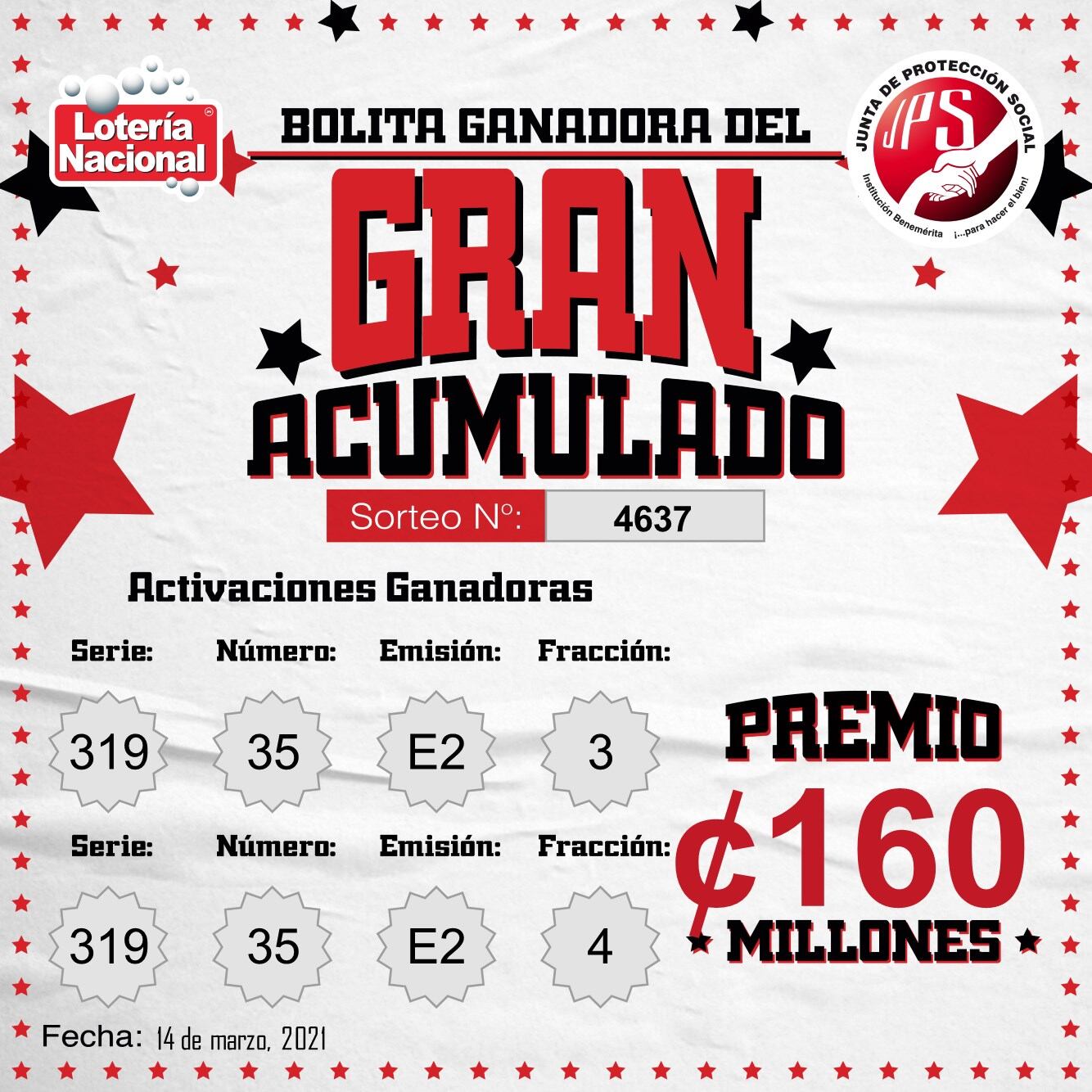 Esta vez, el número favorecido fue el 35 con la serie 319, de las fracciones 3 y 4 (segunda emisión), y el premio es de ¢160 millones.