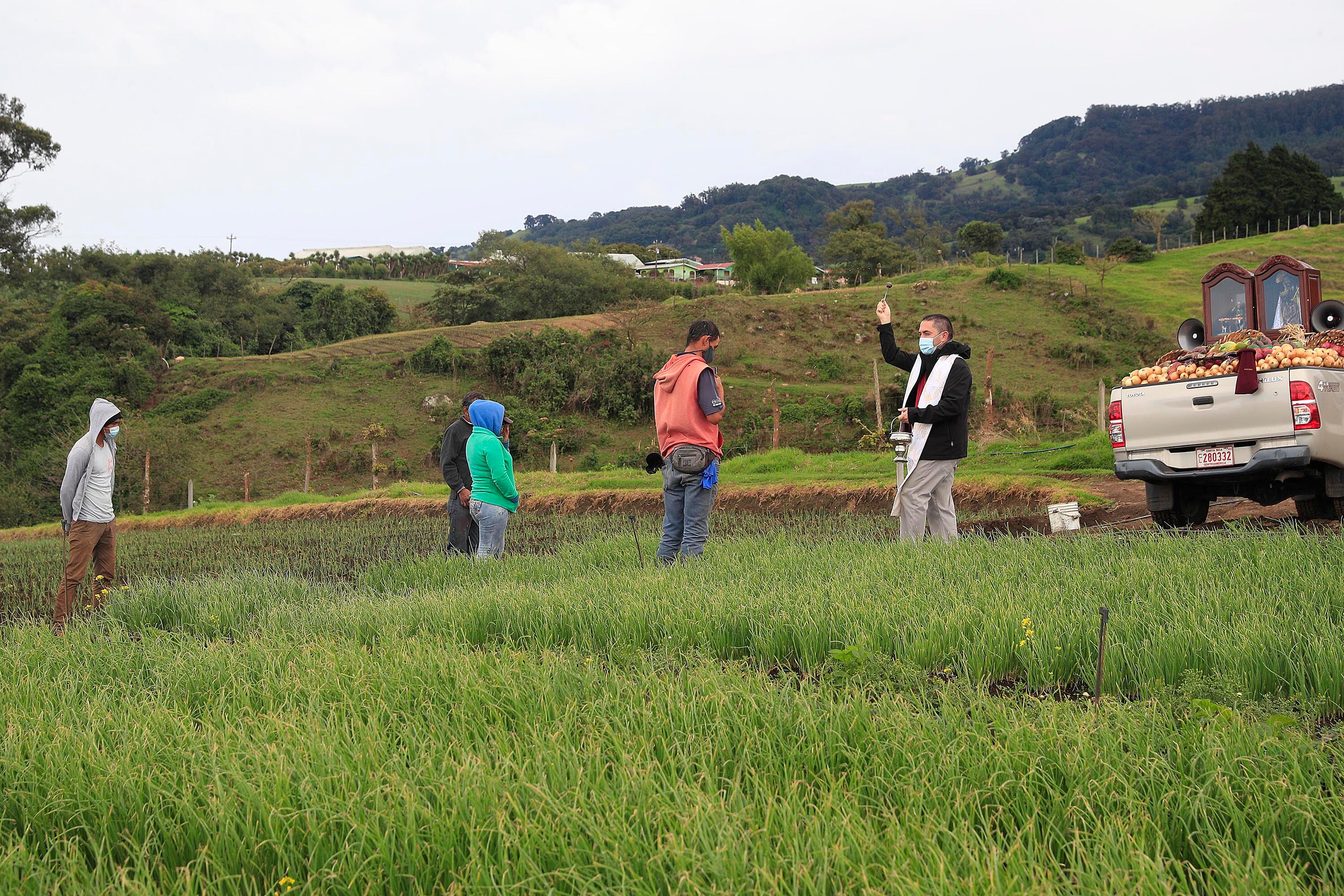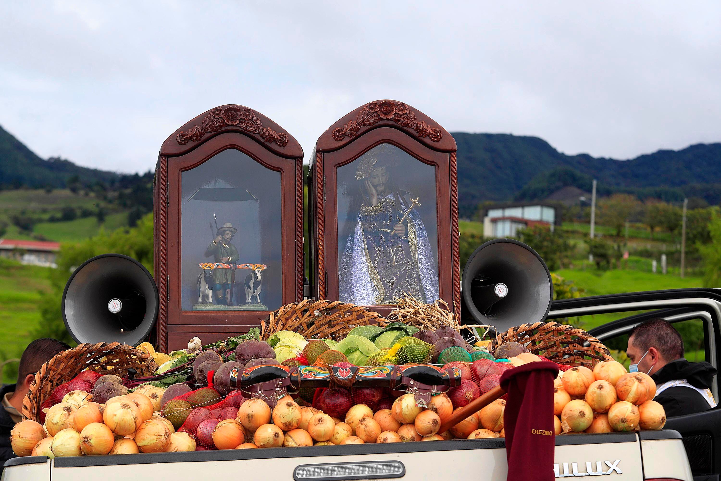 Por segundo año consecutivo, la pandemia impidió hacer el tradicional desfile, pero el párroco Randall Zamora, amarró las imágenes a un pick-up, llenó la canasta con frutas y verduras de la zona y salió con los parlantes para llevar el mensaje.