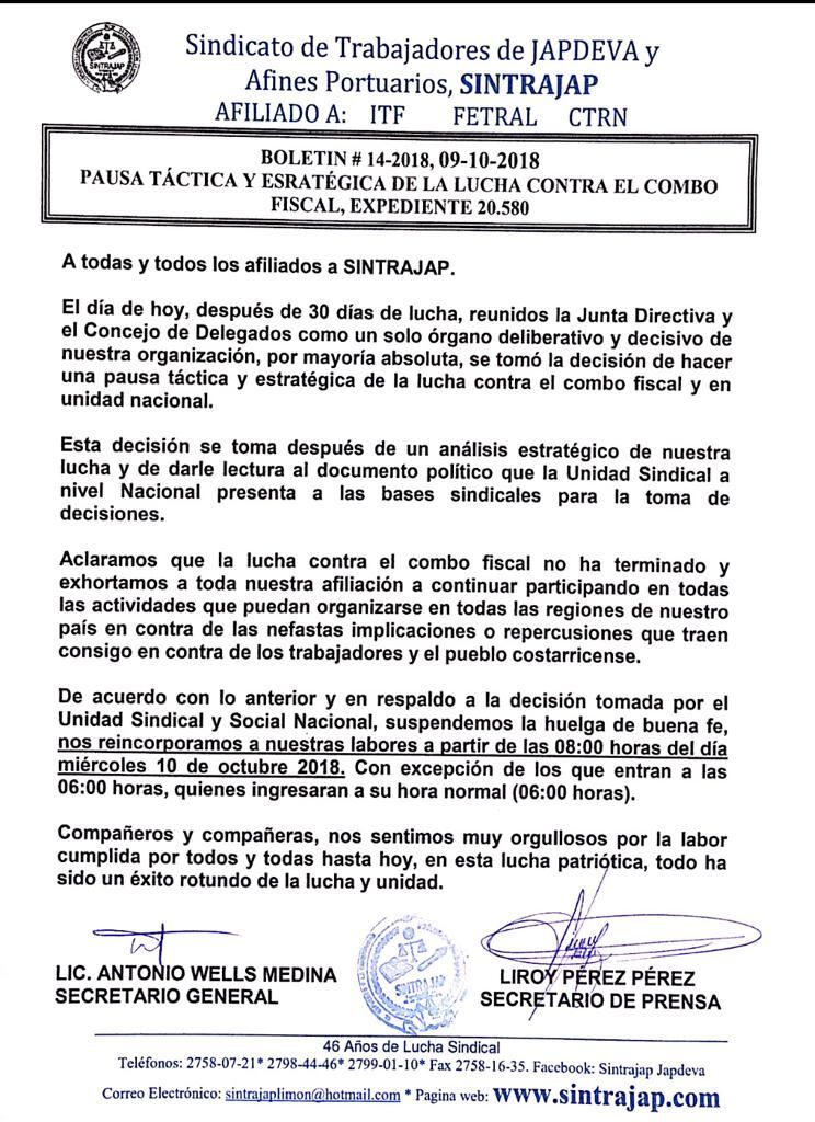 “Llegamos en unidad sindical, como entramos; en unidad sindical a la lucha, igualmente salimos en unidad sindical. Ayer (lunes) se decidió. Hicimos en San José un documento político de las organizaciones, es el comando de lucha que a nivel nacional hace un documento (...) Estamos levantando de buena fe la huelga, vamos a hacer una pausa y vamos a levantar el movimiento mañana a las 8 a.m.”, explicó Wells.