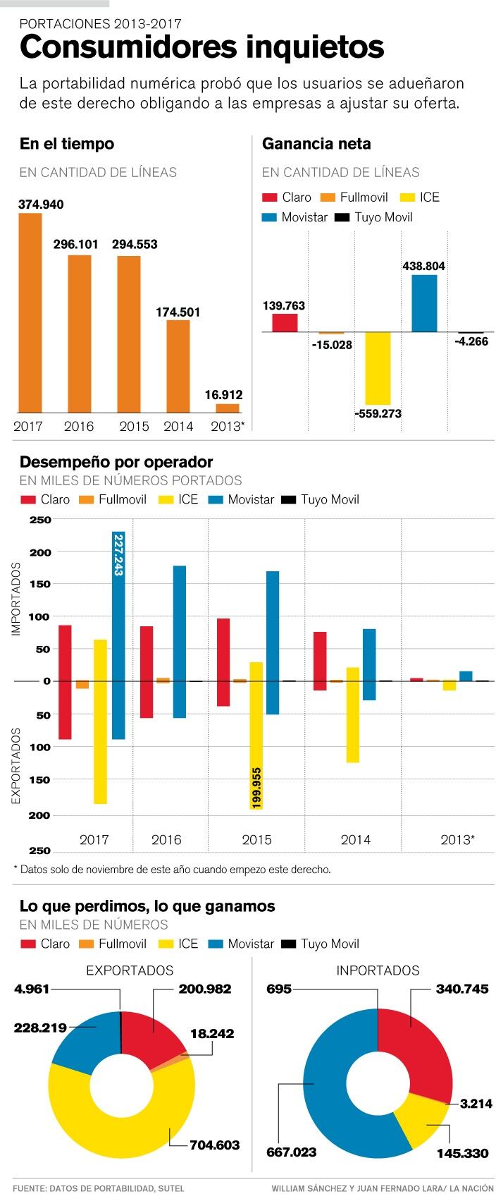 A partir de esa fecha, se habían realizado 1.157.000 traslados hasta el 31 de diciembre, indican estadísticas de la Superintendencia de Telecomunicaciones (Sutel). Esa cifra representa 14% del total de líneas móviles a diciembre del 2016, cuando sumaban 8,3 millones.