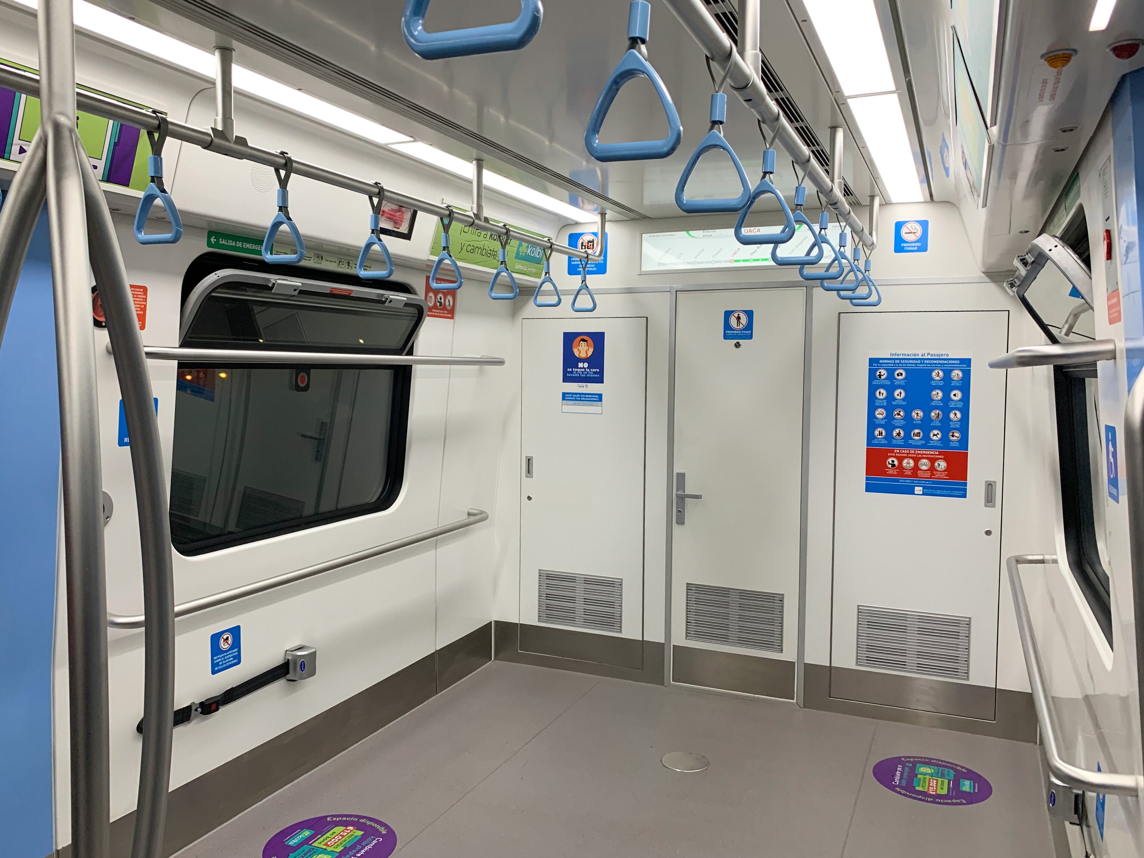 Tiene pasillos amplios, con asientos a los lados, como en los metros. Poseen aire acondicionado, así como pantallas y parlantes para avisar a los pasajeros de la estación a la que se acercan.