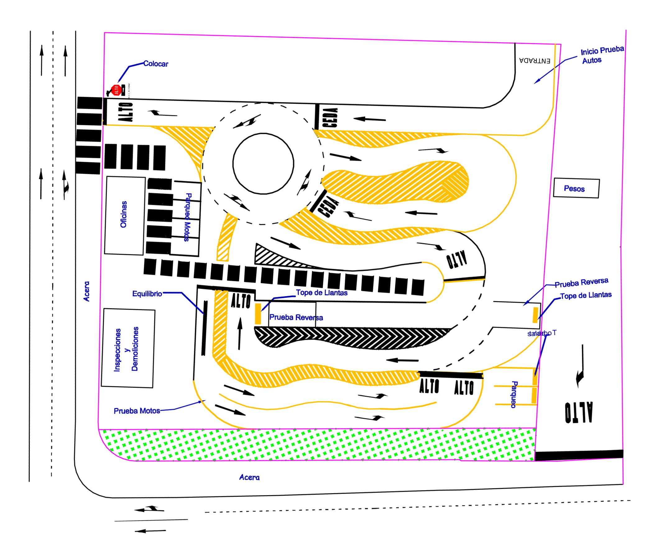 La nueva demarcación, elimina los giros con radio muy cerrado, ya que según explicó días atrás la viceministra, esto no era consecuente con la realidad de las calles del país, además incluye una rotonda y modifica la prueba en reversa haciéndola más lineal.