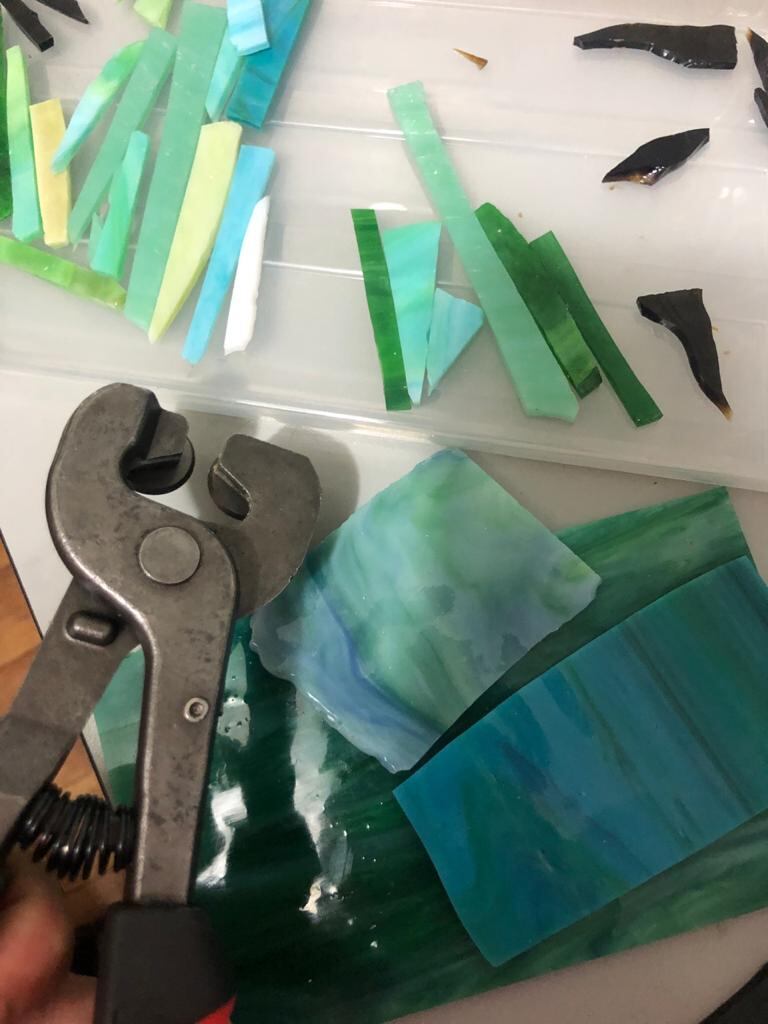 Con devoción e ilusión, la mujer avanza colocando los vidrios color esmeralda que moldearán el rostro de la Virgen. La pieza se complementará con tonos dorados, marrones, rojos, verdes y celestes.
