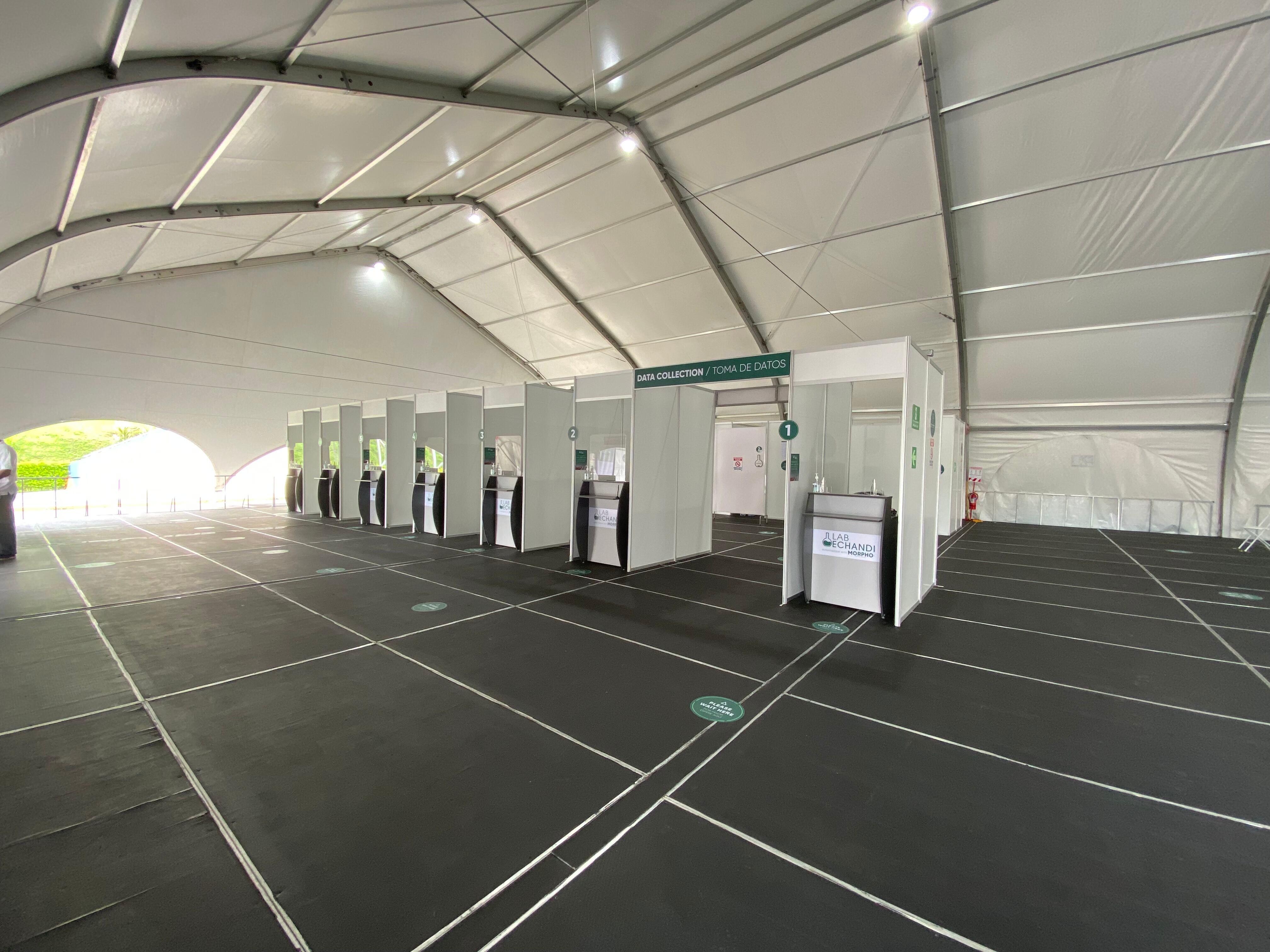 El espacio tiene un área para filas, sala de espera para resultados y una zona de aislamiento para casos positivos.