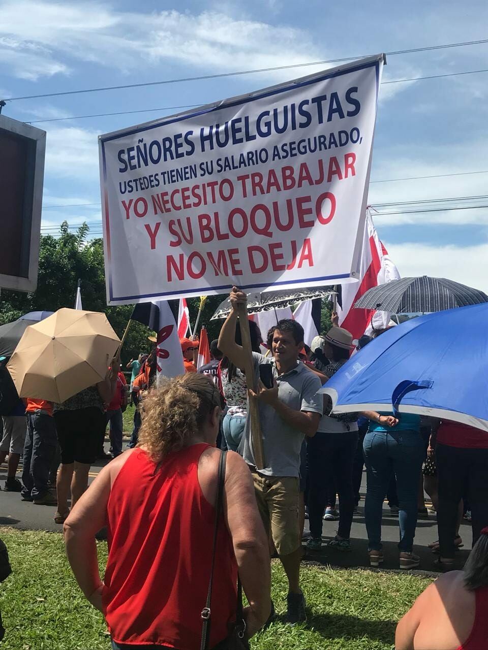 “Señores huelguistas, ustedes tienen su salario asegurado. Yo necesito trabajar y su bloqueo no me deja”, se leía en su cartel cuando ya los bloqueos en la zona había ahuyentado turistas que suelen ir a hacer rafting y tours.