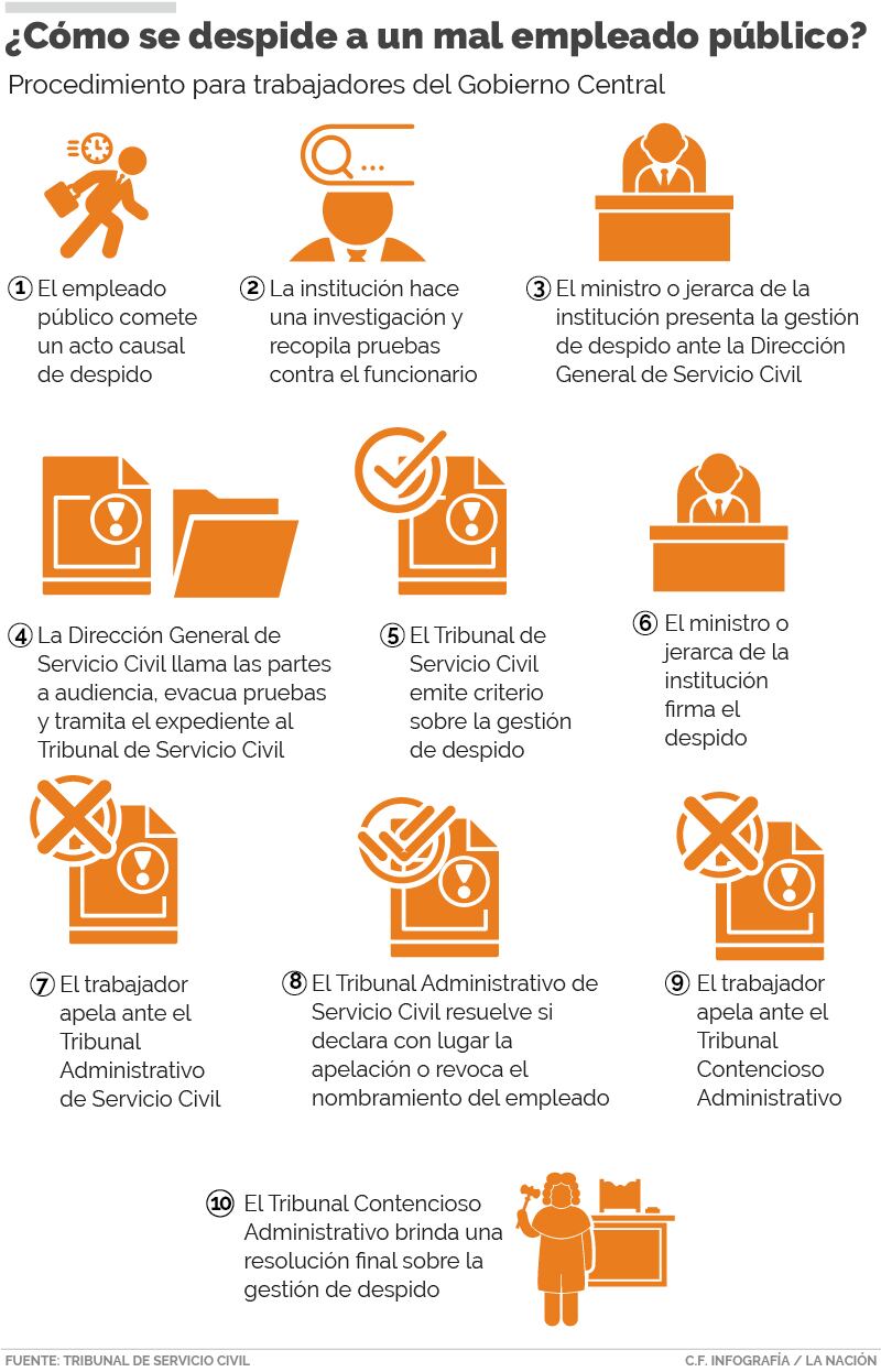 De otra forma, el proceso será lento y complicado, pues la decisión podría rodar hasta por cinco instituciones: la entidad pública a la que pertenece el empleado, la Dirección General de Servicio Civil, el Tribunal de Servicio Civil, el Tribunal Administrativo de Servicio Civil y el Tribunal Contencioso Administrativo.