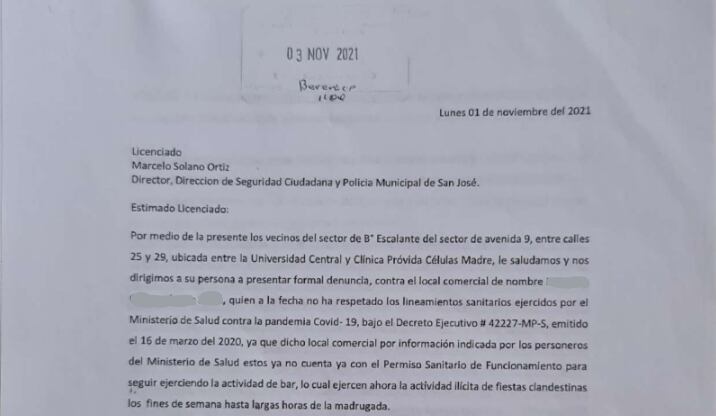 Los vecinos entregaron a este diario copias de numerosas denuncias interpuestas, sin ningún éxito, ante la Municipalidad de San José y el Ministerio de Salud, porque según ellos, las entidades siempre envían a funcionarios a hacer las revisiones en días y horas en los que no se presentan los desórdenes. Por ejemplo, señalan que el problema sucede en las noches de jueves a domingo y que así lo indican en las denuncias, pero que las autoridades realizan sus visitas de lunes a miércoles, en horario diurno.