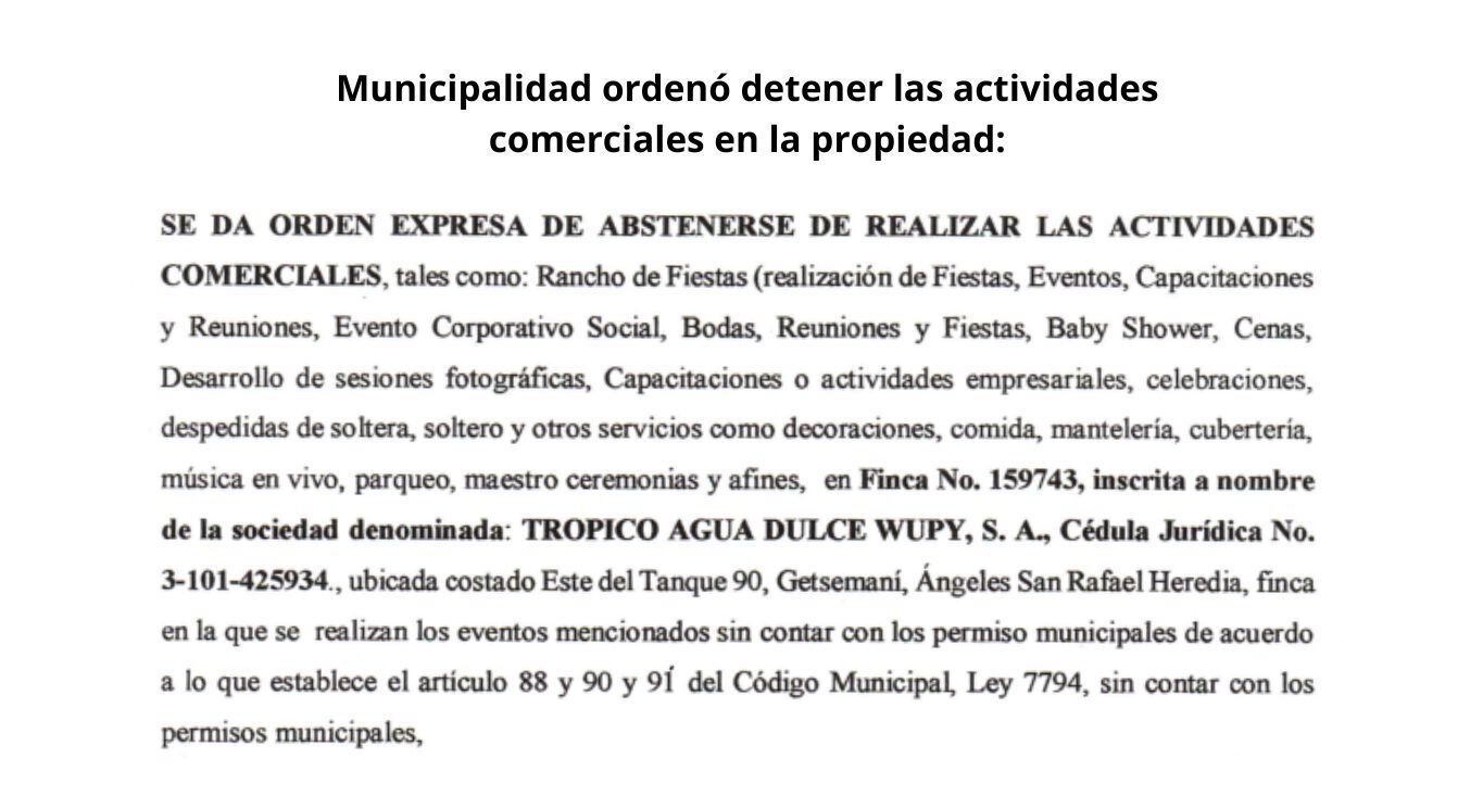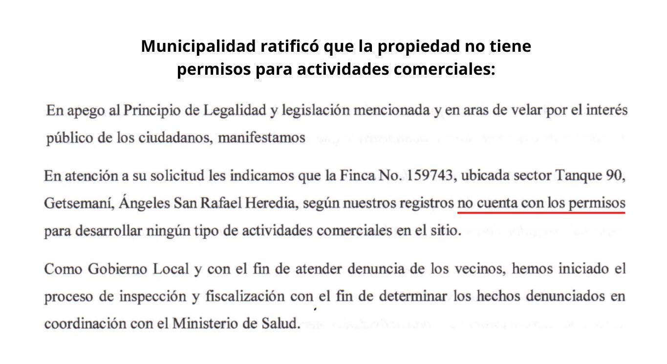En esa misma fecha, el Área Rectora de Salud de San Rafael-Barva les ordenó cesar las actividades comerciales, dado que no contaban con el permiso sanitario de funcionamiento respectivo. Sin embargo, los vecinos aseguran que los escándalos continúan cada fin de semana.