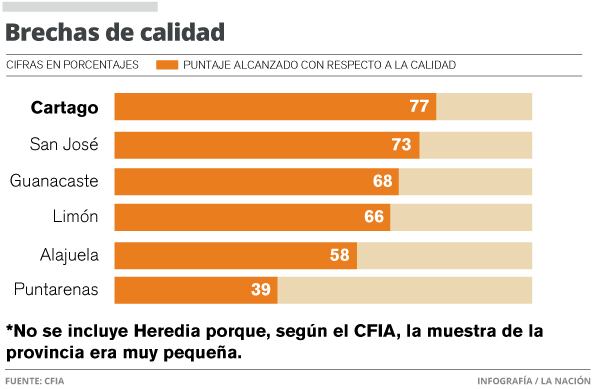 "En la mayor parte de las provincias el cumplimiento general de las condiciones de calidad anda en alrededor de un 75% y 80%, que consideramos adecuado. Hay una preocupación particular en dos provincias: Puntarenas con un 39% de cumplimiento, y en Alajuela, un 55% por ciento", manifestó Olman Vargas.