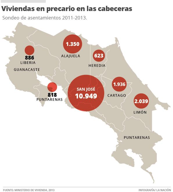 Entre las últimas mediciones realizadas están el Diagnóstico y Propuesta de Atención de Precarios (2014) de la Cámara Costarricense de la Construcción (CCC), la Asociación Centroamericana para la Vivienda (Acenvi) y FinanVivienda; también el Catastro Nacional de Asentamientos Pobres (2014), de Techo; el Censo de población del 2011 y los conteos del propio del Ministerio de Vivienda, el más reciente realizado en el 2012.