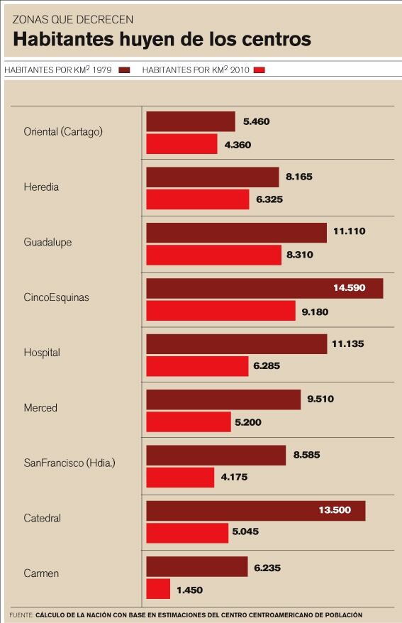 Por ejemplo, en los 2,8 kilómetros que conforman el distrito central de Heredia, la densidad bajó de 8.160 a 6.325 personas por kilómetro cuadrado entre 1970 y la proyección para el 2010.