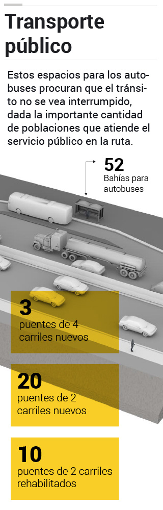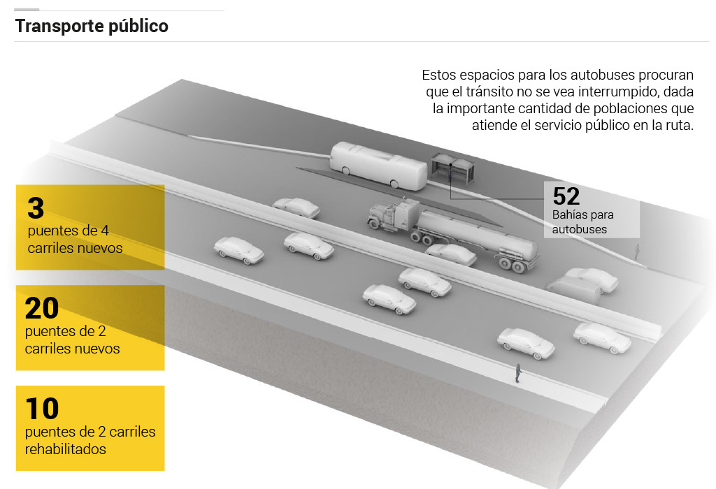 La pista cuenta con cuatro carriles en losa de concreto y presenta numerosas facilidades para que los viajeros se desplacen de manera cómoda y segura.