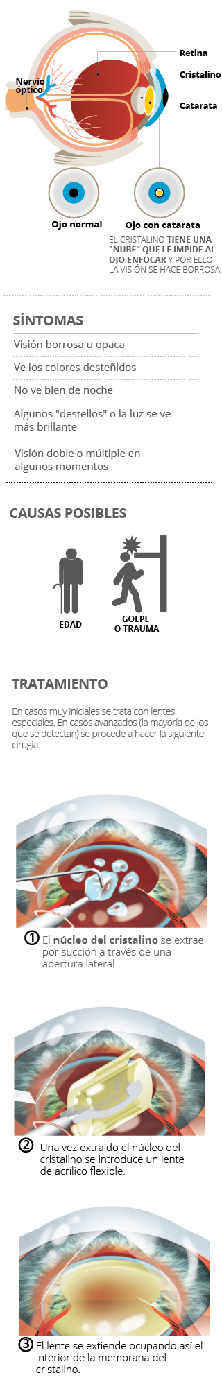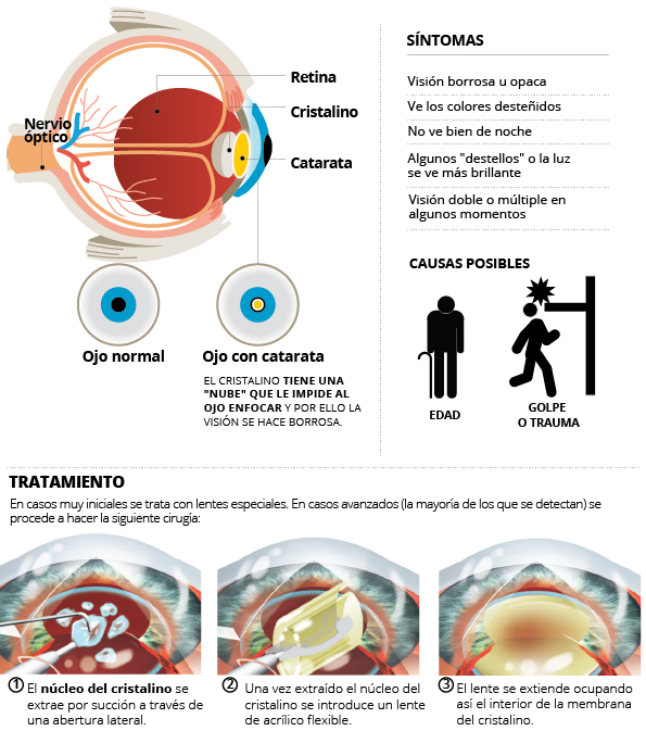 El cristalino, el "lente" del ojo que sirve para enfocar, es usualmente claro y transparente. Una catarata es una "nube" que se forma en el cristalino que hace que la visión se torne borrosa..