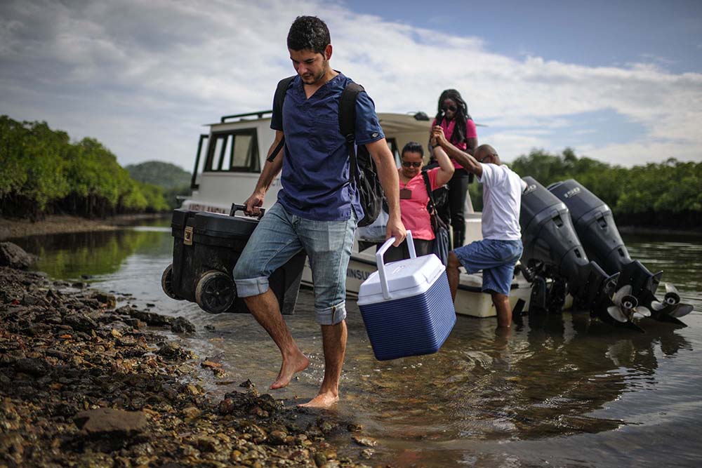 La lancha San Antonio atraca en el sector que lleva su mismo nombre en Chira. Con ayuda del capitán de la nave bajan el médico Róger Rodríguez, la encargada de registros médicos Carmen Morales, y la farmacéutica Patricia Brown.