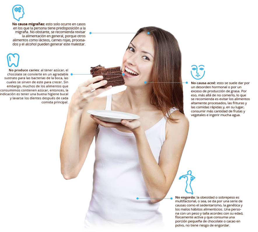 Al consumir chocolate, algunas personas muestran mayor predisposición a padecimientos como el acné, la obesidad, las caries y la migraña. Sin embargo, no es cierto que su consumo sea el responsable directo de estos males.