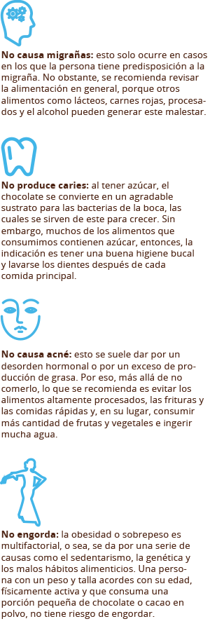 “Todos los cuerpos son distintos y cada uno reacciona diferente, por lo que a algunas personas comer chocolate sí les podría generar espinillas, incluso dar migrañas. Estos casos se deben tratar individualmente; la mejor manera de hacerlo es dejar de comerlo por un tiempo y luego introducirlo a la dieta poco a poco, para ver cómo reacciona el cuerpo”, afirma la nutricionista Aurora Marlasca.