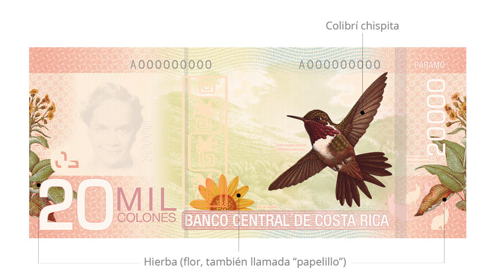 Motivo principal: colibrí chispita y hierba (flor, también llamada “papelillo”).