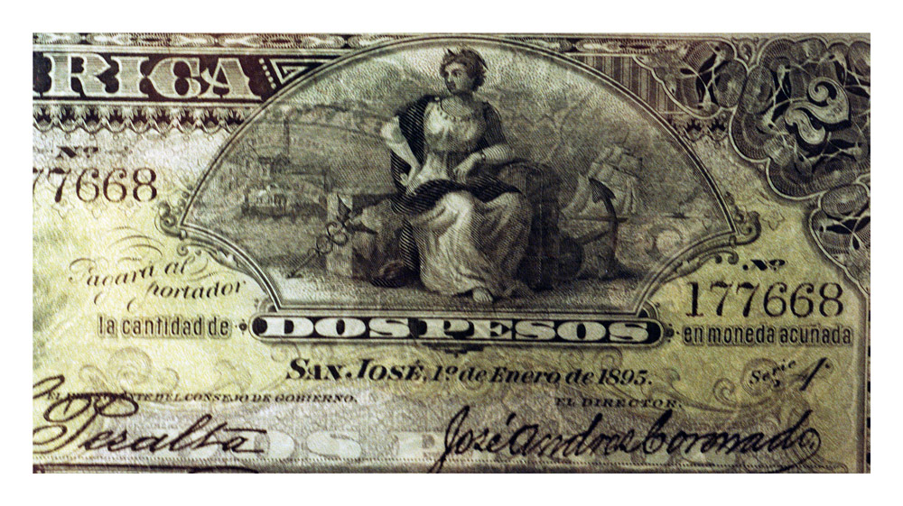 Se funda el primer banco del país, llamado Banco Nacional Costarricense, que emite billetes de 1, 2, 10 y 20 pesos, de las series A y B.
