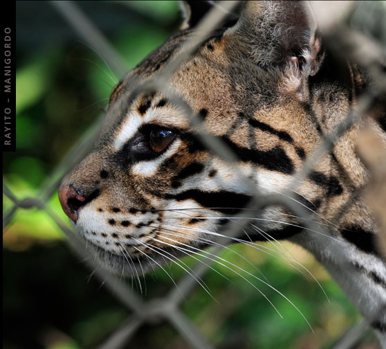 Fue abandonado en Ostional cuando era un bebé, hasta el ombligo y el pelo erizo tenía. Los felinos requieren estar dos años junto a su madre para aprender a cazar y defenderse en el bosque. Al ser huérfano, Rayito vive en cautiverio.