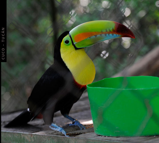 Cuco es un tucán pico iris que reside en el Centro de Rescate Las Pumas. Junto a su hermano, fue rescatado cuando era vendido a ¢20.000 en Bagaces, Guanacaste.
