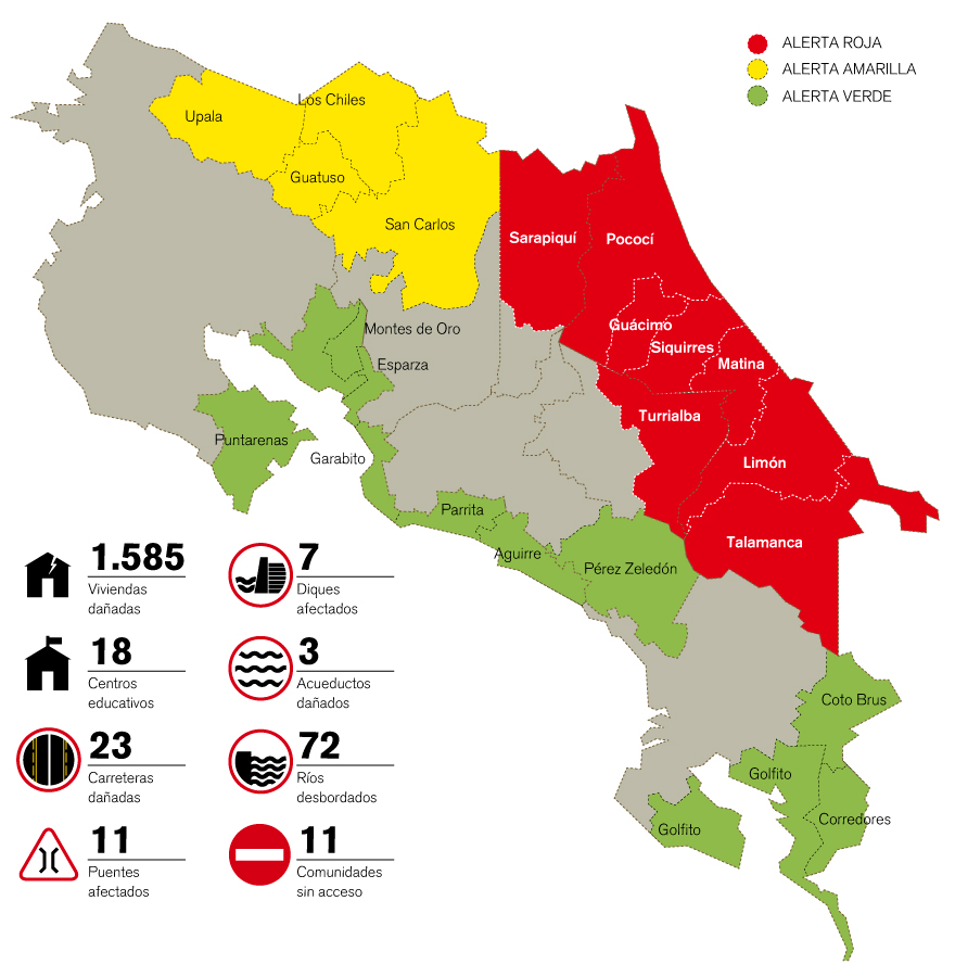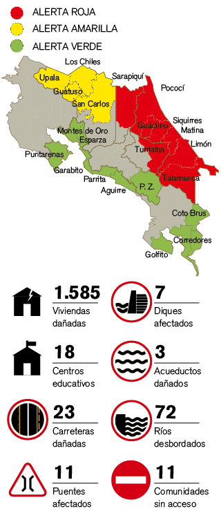 El último informe de la CNE indica que los daños abarcan 216 comunidades, 1.585 viviendas, 18 centros educativos, 23 carreteras, 11 puentes, 7 diques y 3 acueductos.