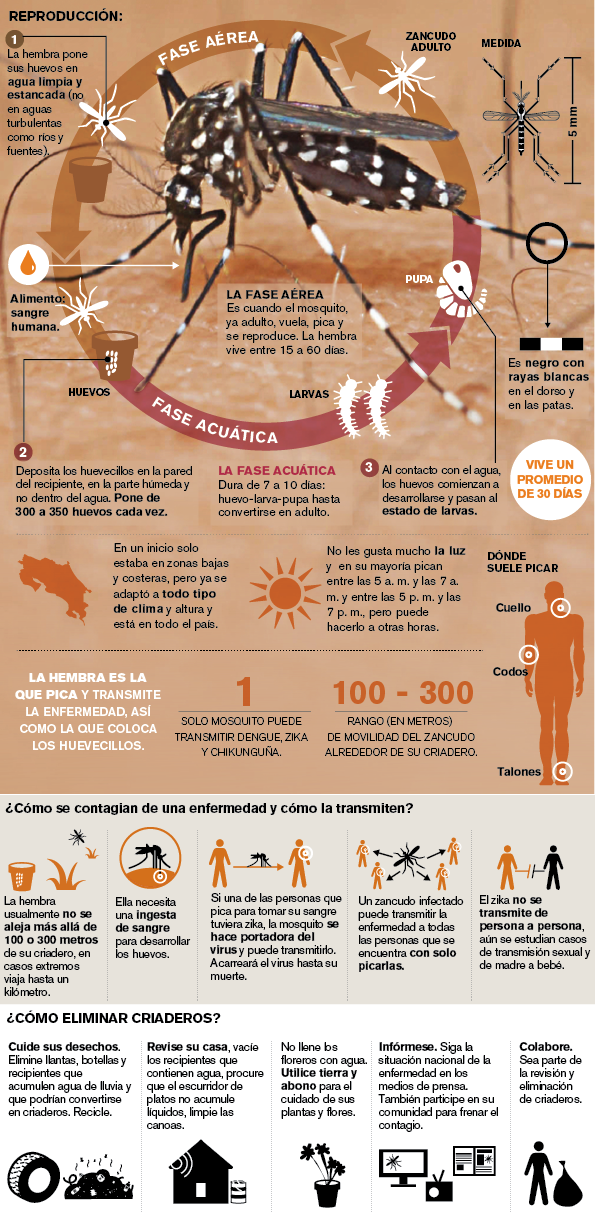 La hembra del zancudo Aedes aegypti es la responsable de transmitir varios virus a la vez, entre ellos: dengue, chikunguña y zika. La tarea en todos los hogares es destruir sus criaderos.