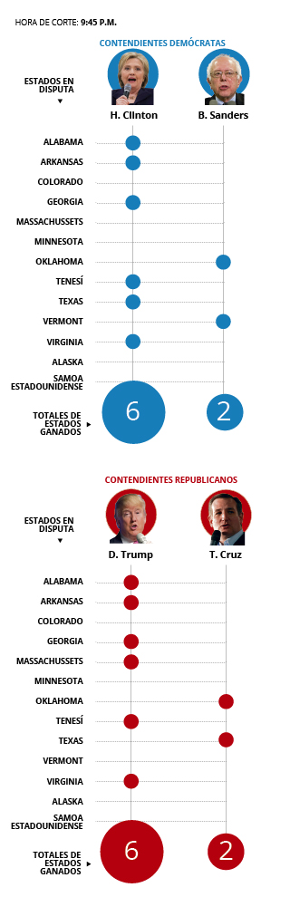 IUna docena de Estados celebraron en el supermartes sus primarias o caucuses para elegir su candidato a la Presidencia. Este es el escenario que dejó una de las citas más importantes del año electoral en Estados Unidos.