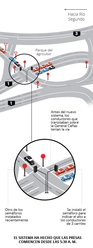 Nuevos semáforos en la General Cañas provocan presas que afectan a los conductores.