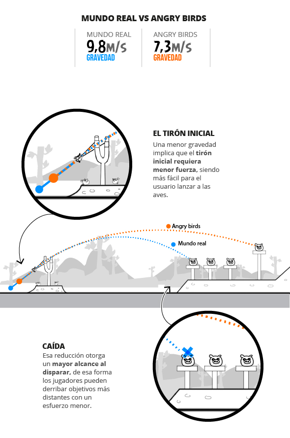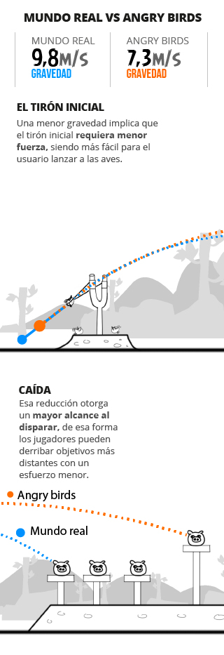Las leyes de la Física no siempre aplican en el mundo virtual. Un ejemplo de ello es la decisión de los desarrolladores de Rovio, que modificaron la percepción de la gravedad en el juego, con la intención de reducir la resistencia y evitar la frustración del usuario.