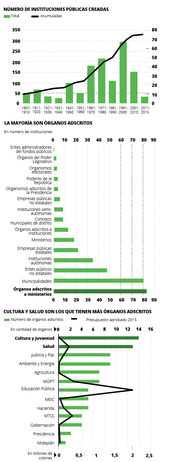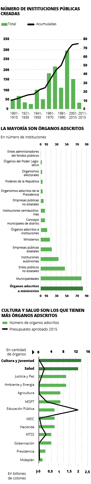 Desde 1900 hasta ahora, el Estado costarricense no ha dejado de crecer y hoy tiene 332 instituciones, entre órganos adscritos, instituciones semiautónomas, autónomas, entes públicos estatales y no estatales, y municipalidades, entre otros.