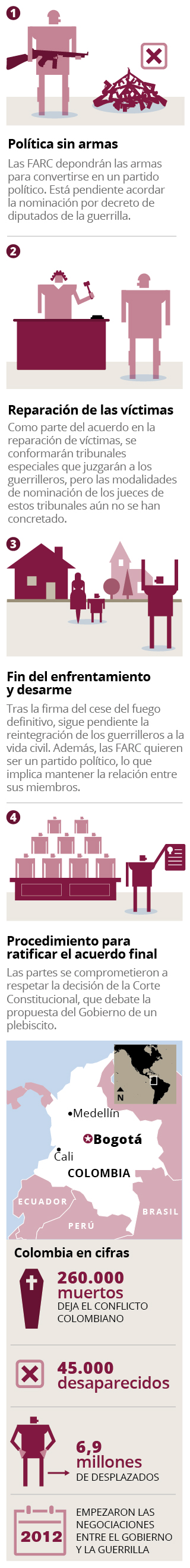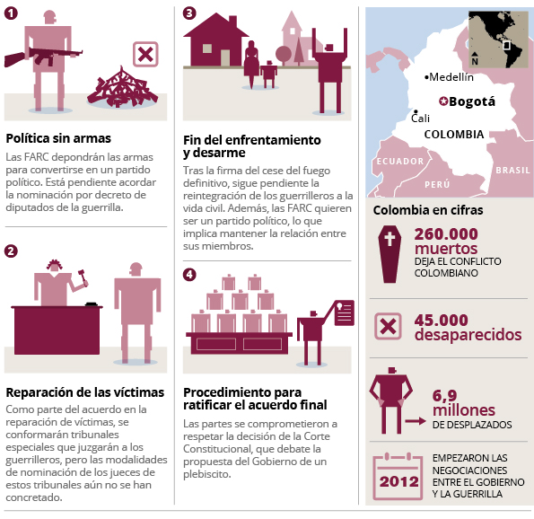 La firma de un pacto sobre el cese del fuego definitivo en Colombia corona tres años y medio de negociaciones y acerca la próxima validación de un acuerdo de paz, pero aún hay temas en la agenda que deben resolverse.