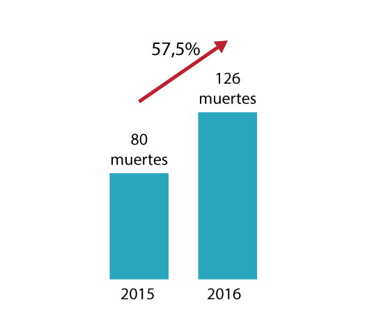 Mientras en el 2015 se registraron 80 muertes, en el 2016 la cifra subió a 126 (57,5%).