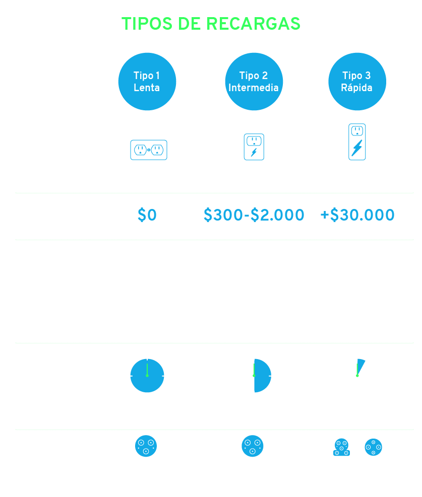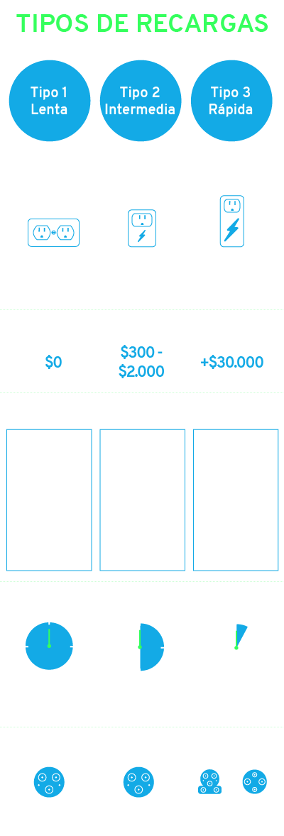 Tipo 3 o rápida (terminal de 440 voltios, de uso municipal y de instalación complicada -puede costar $30.000)