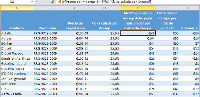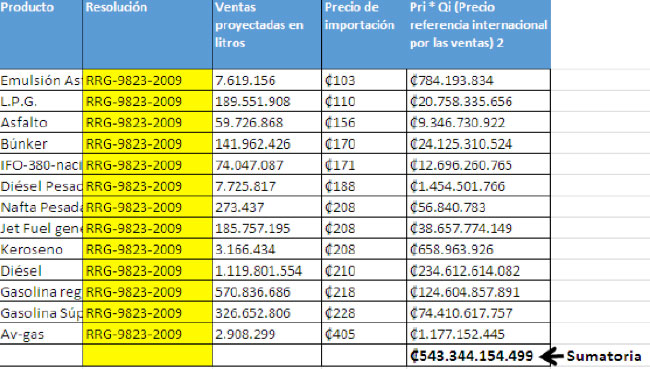 In order to find the amount consumers paid in excess or were undercharged from 2009 through 2013, the total sales of each fuel were multiplied by the costs assigned by ARESEP and also by RECOPE’s real costs. The result of the second multiplication was detracted from that of the first one.