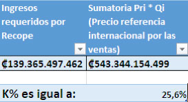 To estimate K%, the regulator body multiplies the international purchase price of each liter by the projection of its total year sales. The result of those operations is divided into the income required by RECOPE to cover its costs.