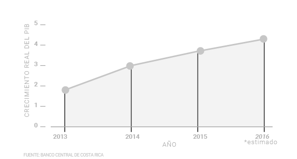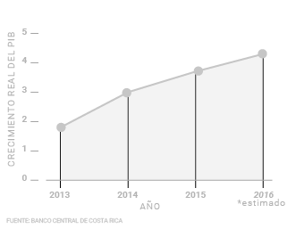 La economía costarricense creció un 3,7% en términos reales en 2015, según datos del Banco Central. Este crecimiento superó al de 2013 y 2014 de 1,8% y 3%, respectivamente. No obstante, la meta de crecimiento establecida en el Plan Nacional de Desarrollo para el 2015 era de un 4%.
