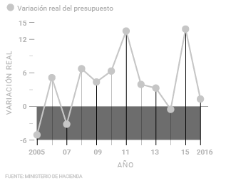 "El Presupuesto para 2016 creció un 0,5% en términos nominales en comparación al presentado un año antes. No obstante, esto no refleja el verdadero aumento ya que no ajusta las cifras por inflación. En términos reales, el presupuesto para este año creció un 1,3% respecto del de 2015. Si bien este aumento fue mucho menor al de 2014 - 2015 (13,8%), no ha sido el más bajo de la última década.Desde 2006, en dos ocasiones se dio un crecimiento menor: De 2006 a 2007 el presupuesto decreció en 3,2% y de 2013 a 2014 cayó un 0,5%, en términos reales."