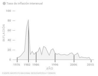 "El 2015 se registró la inflación más baja desde 1976, según el Instituto Nacional de Estadística y Censos. A diciembre de 2015 la inflación interanual fue de -0,8%. La variación negativa en el índice de precios al consumidor (IPC), no fue producto de una política monetaria restrictiva. La caída del IPC obedece a la reducción en el precio externo de materias primas, en particular del petróleo y sus derivados, bajos precios en servicios regulados como agua y electricidad, y de algunos bienes de origen agrícola. "