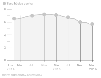 La tasa básica pasiva ha decrecido desde octubre anterior. Pasó de 6,2% a finales de ese mes a 5,7% a finales de febrero de 2016. Las menores tasas de interés obedecen a cambios en el método para calcular la tasa básica y la implementación de una política de gestión de deuda del Ministerio de Hacienda. Tasas tan bajas no se observan desde principios de 2008.