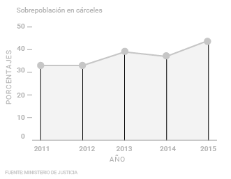 A finales del 2015 el hacinamiento carcelario fue de 44% mientras que en setiembre de ese mismo año alcanzó el 52%, según datos del Ministerio de Justicia. A abril de 2016 esta cifra disminuyó a un 40,49%. Sin embargo, la meta del Plan Nacional de Desarrollo para 2015 era reducir este indicador a un 36,4%.