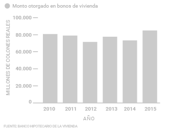 La cantidad de bonos otorgados en el 2015 fue la mayor de los últimos seis años, según el Banco Hipotecario de la Vivienda. Se entregaron 10.867 bonos, 1.063 más que en 2014. A su vez, el año pasado se ejecutó el monto más alto de los últimos seis años: ₡84.249 millones, para un crecimiento real del 16% en comparación a lo gastado en el 2014.