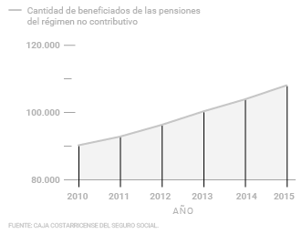 "En el 2015 se atendió la mayor cantidad de personas por pensiones del régimen no contributivo. En total 108.069 personas recibieron este beneficio durante el 2015, es decir, 4.000 más de las atendidas en el 2014. A su vez, el monto destinado al pago de esas pensiones fue de ¢131,6 millones de millones un 5% más (en términos reales) que lo ejecutado en 2014. "