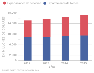 Las exportaciones de servicios fueron de $7.595,1 millones, lo cual representó un crecimiento real del 5%. Las exportaciones de bienes, sin Intel, se mantuvieron constantes. Si se incluyen los microprocesadores, fueron $9.587 millones; una caída de 15,8% en términos reales en 2015 respecto al año anterior. Las exportaciones de zonas francas cayeron (22%), mientras que los productos tradicionales bajaron 3%.